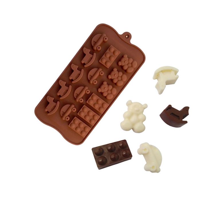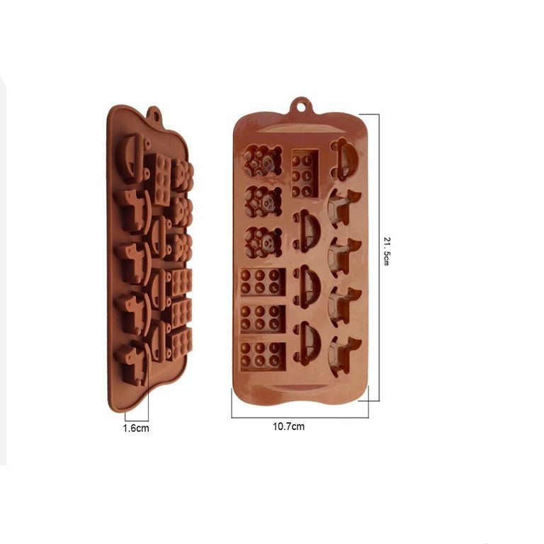 Форма Детские игрушки состоит из 15 ячеек, в которые входит машинка, лошадка-качалка, лего детали и мишка. Композиции очень будет актуальна на детский праздник в виде декора на десерте, или в виде подарочного шоколадного набора. Подходит для изготовления шоколадных конфет или для декора кондитерских изделий из шоколада, мастики, марципана. Проста в уходе и при правильной эксплуатации прослужат не один год. Форму можно растянуть, сложить пополам или даже вывернуть наизнанку, если вам так удобнее вынимать изделия. Принцип работы с силиконовыми формами предельно прост: вы просто производите заливку смеси или утрамбовываете массу в форму, а потом проводите необходимые манипуляции (оставляете остывать, замораживаете, запекаете и т.д.). Силикон выдерживает температуру от -40 до 230 °С; материал не впитывает запахов и полностью безопасен для продуктов питания; форма легко отмывается, в том числе в посудомоечной машине.