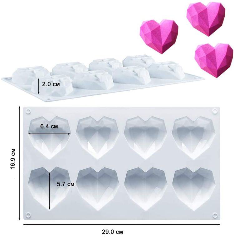 Форма выполнена в виде небольших сердец с гранями из 8 ячеек. Аккуратные шоколадные сердца, или мини пирожное будут всегда кстати на любом празднике. Возможность создать небольшой презент для своей половинки на 14 февраля, годовщину или в виде признания чувств…делать приятное для своих близких и родных людей совершено легко с помощью наших силиконовых форм.