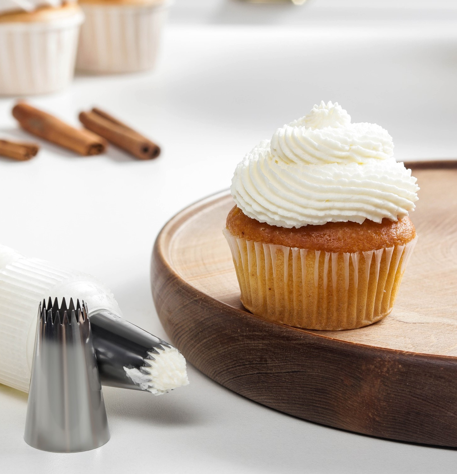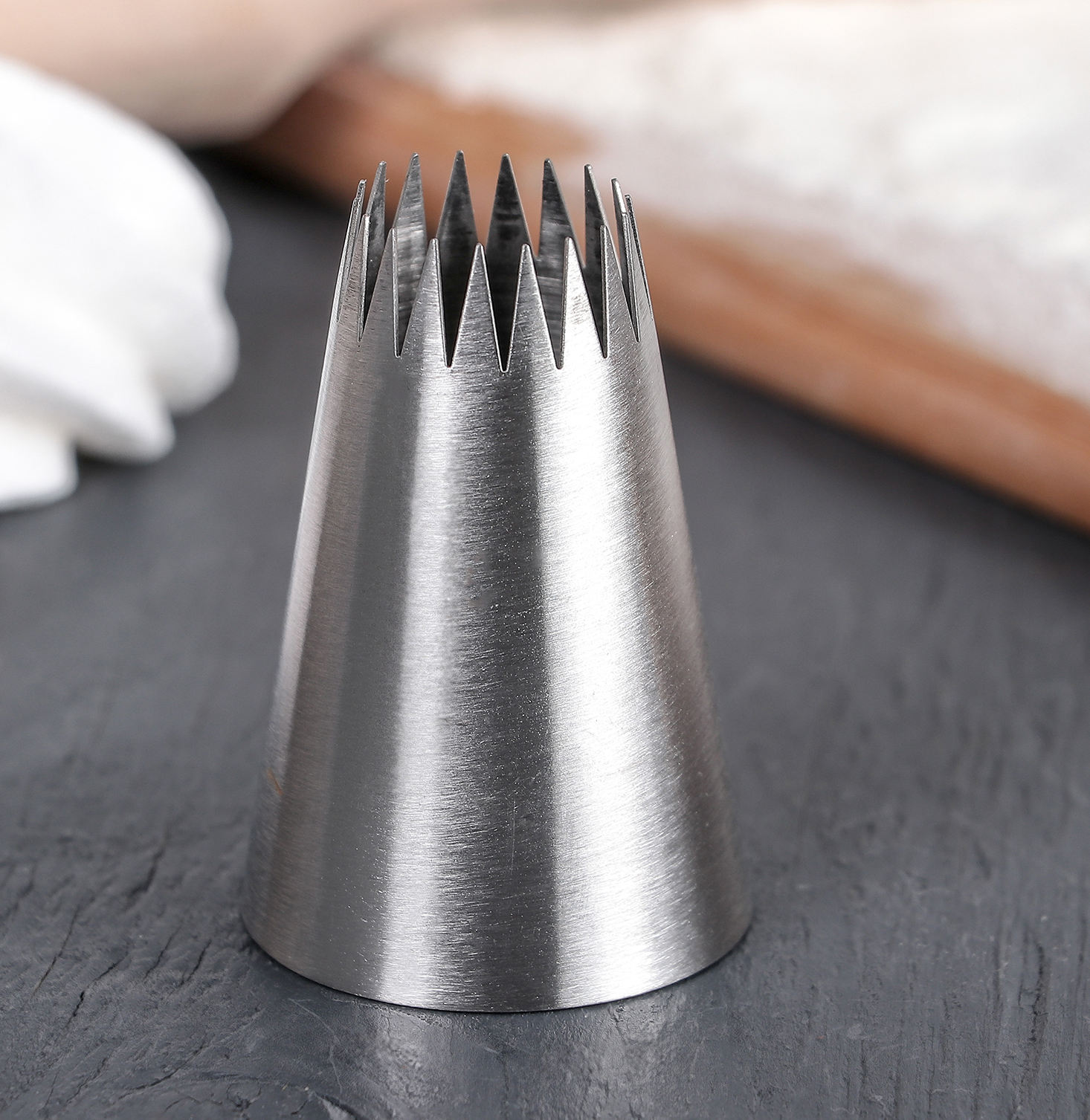 Насадка для крема – это простое приспособление, без которого современный кондитер не сможет обойтись. Кондитерская насадка идеально подойдет для украшения капкейков и тортов, удобна в работе и её с легкостью смогут использовать даже начинающие кондитеры. Насадка изготовлена из пищевой нержавеющей стали с использованием лазерной резки. Все насадки для крема снабжены двумя отверстиями, одно из которых большего диаметра. Этой стороной устройство закрепляется в мешке или шприце. Меньшая часть конуса обычно имеет узорчатый внешний вид, придает крему нужную форму. Кремовые украшения получаются благодаря разным размерам форм и диаметрам насадок. Небольшие металлические конусы позволяют выводить на торте или капкейке кремовые цветы, листья, траву, замысловатые узоры или простые идеальные линии. При грамотном использовании насадок можно оригинально украсить торт разнообразными узорами.