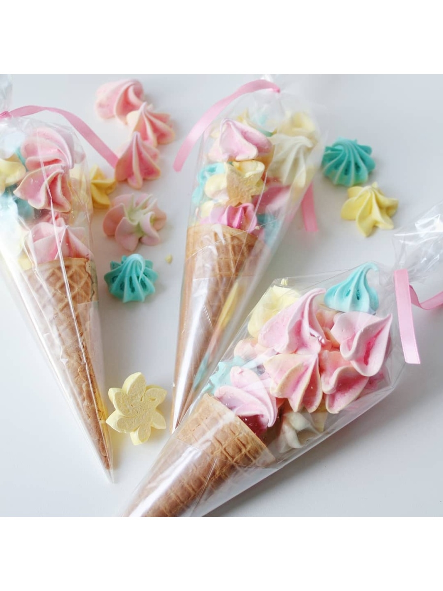 Упаковочные пакет-конус из прозрачного полипропилена подходят для упаковки кондитерских изделий: меренги, леденцов, безе, конфет и т.д., для декора можно использовать вафельные рожки. Пакет придаст оригинальный вид вашему изделию и защитят от лишнего внешнего воздействия.