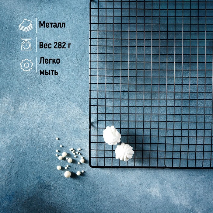 Решетка для глазирования и остывания кондитерских изделий, для домашнего и профессионального использования. Корпус выполнен из металла устойчевого к корозии, поверхность легко моется. Решетка обеспечивает хорошую циркуляцию воздуха, что препятствует отсыревание выпечки.