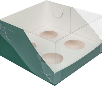 Коробка на 4 капкейка с пластиковой крышкой, цвет зеленый мат., размер 16*16*10 см